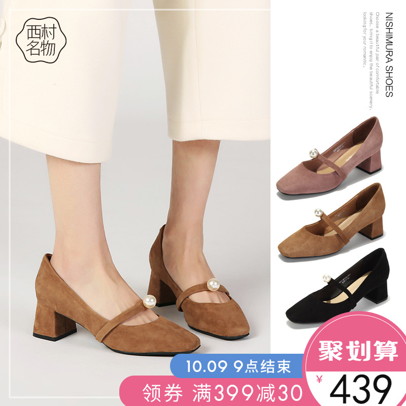 西村名物春秋韩国方头绒面粗跟中跟婚鞋玛丽珍女单鞋X271E33918