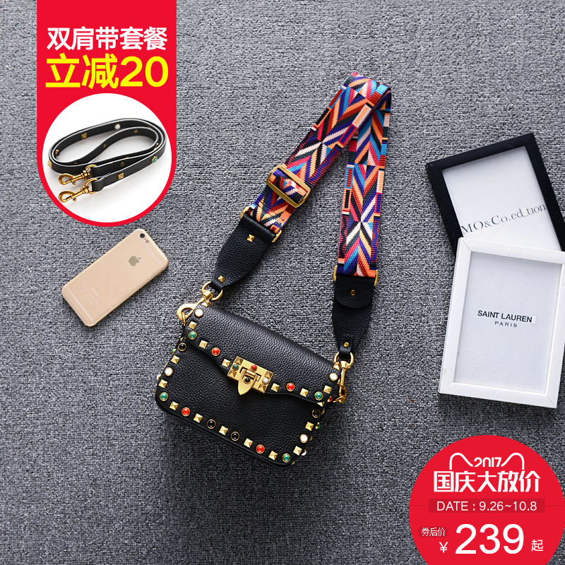 ZAMO真皮镶钻彩色铆钉小方包针织宽肩带单肩挎包复古锁扣邮差女包