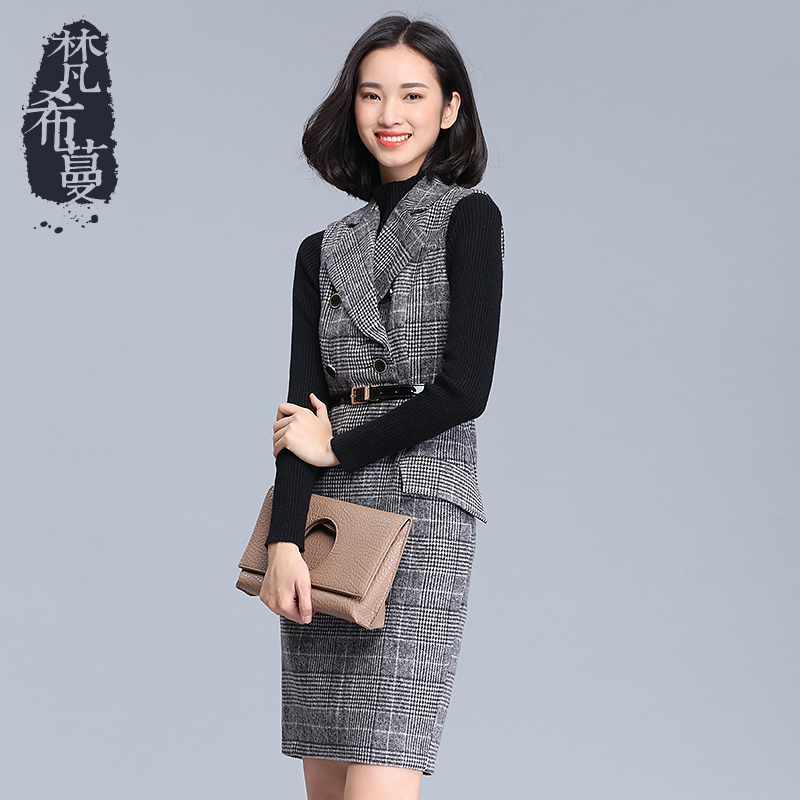 梵希蔓毛呢连衣裙秋冬新款女装OL通勤无袖翻领修身包臀格子背心裙