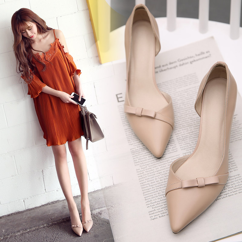 白色高跟鞋细跟女鞋秋蝴蝶结尖头单鞋女裸色婚鞋韩版工作皮鞋子女