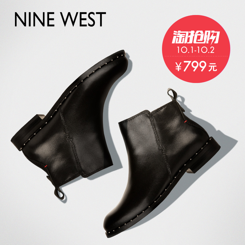 ninewest/玖熙2017秋冬新款牛皮短靴 舒适粗跟圆头切尔西靴 靴子