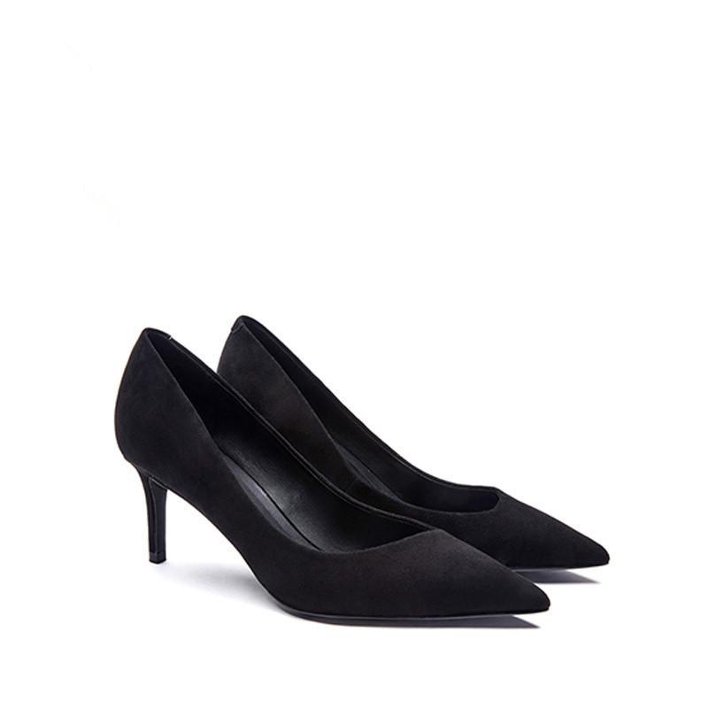 烫社交女鞋时尚黑色羊猄皮羊反绒面尖头高跟鞋细跟中跟浅口单鞋女