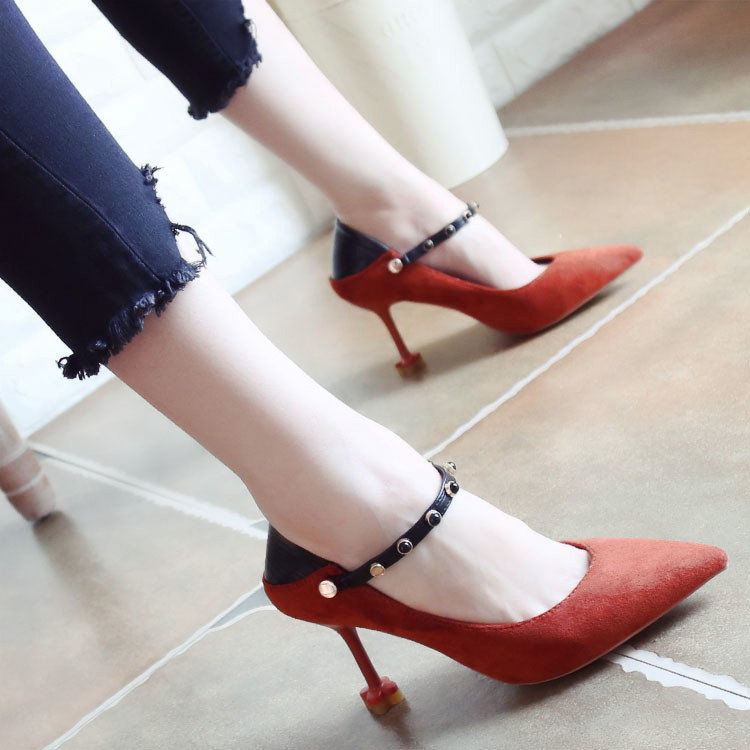 时尚猫跟尖头女鞋2017秋季新款细跟高跟鞋欧美浅口一字扣绒面单鞋