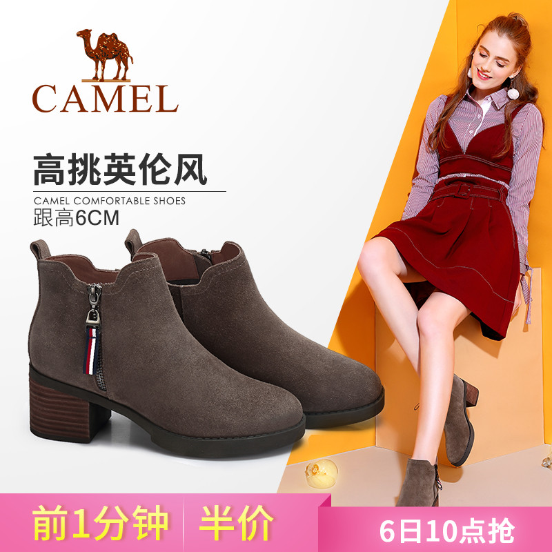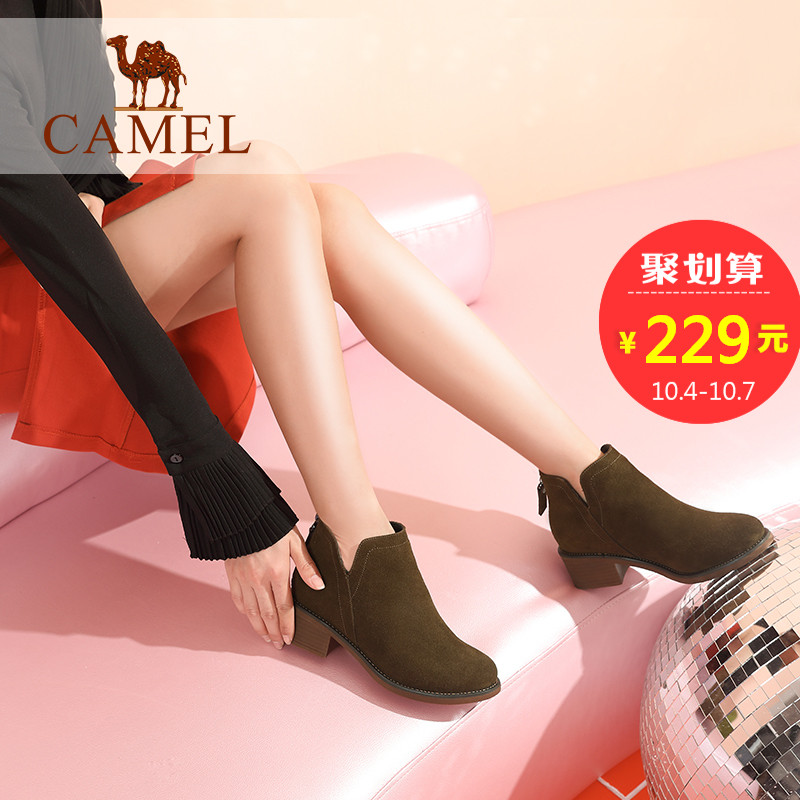 骆驼女鞋 2017秋冬绒面粗跟短靴女英伦百搭磨砂皮短筒女靴子