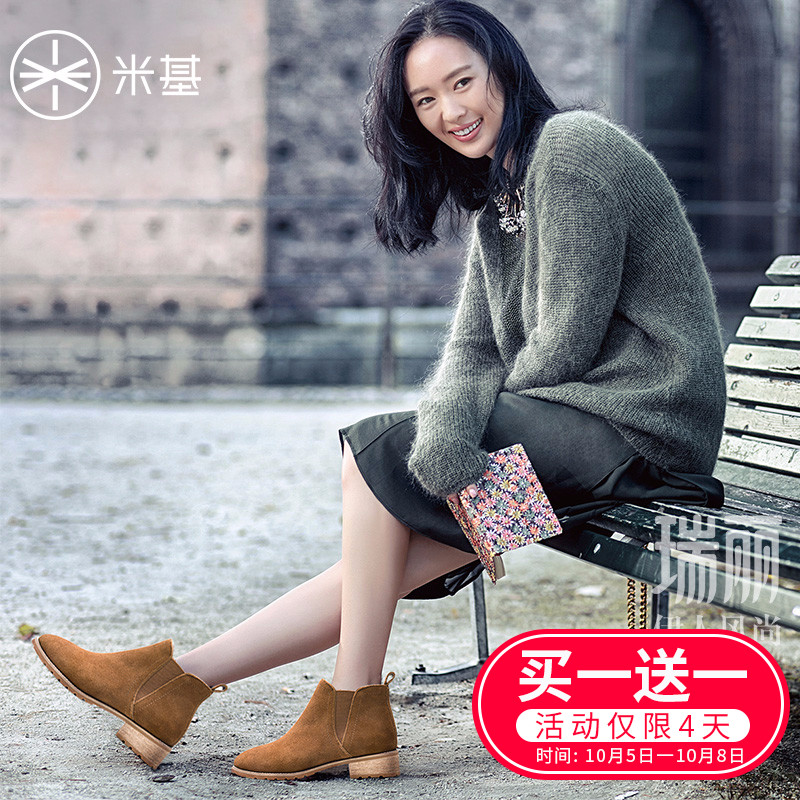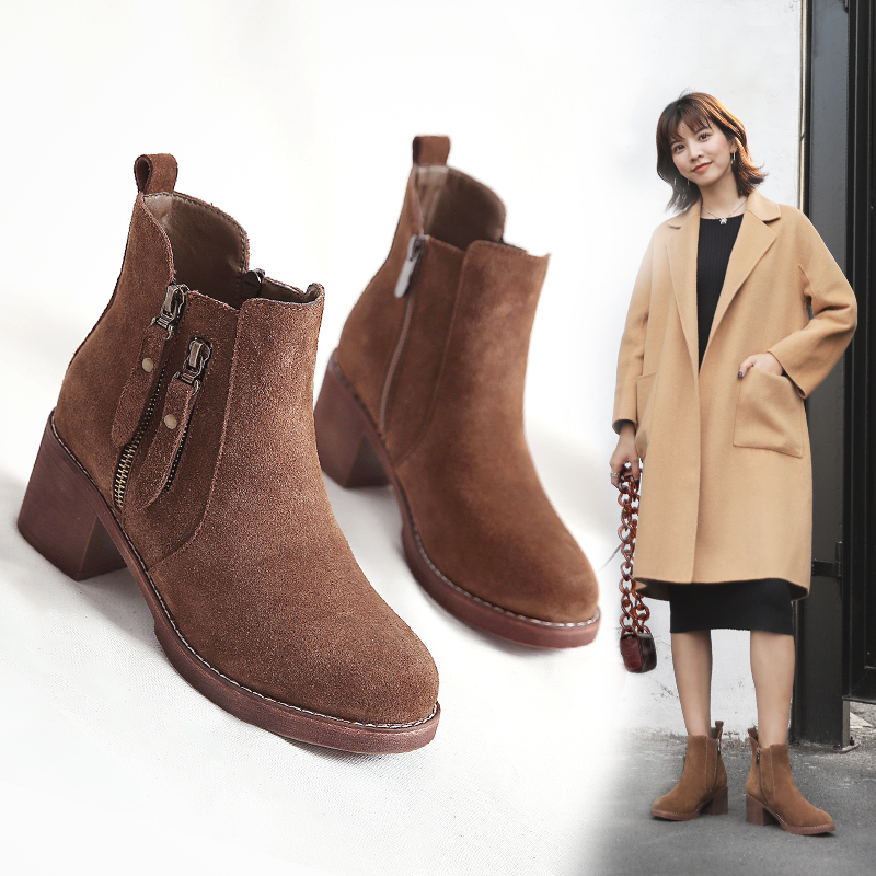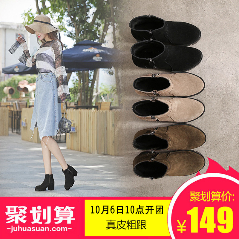 依思q2017冬靴新款韩版牛反绒真皮短靴中粗跟靴子女靴