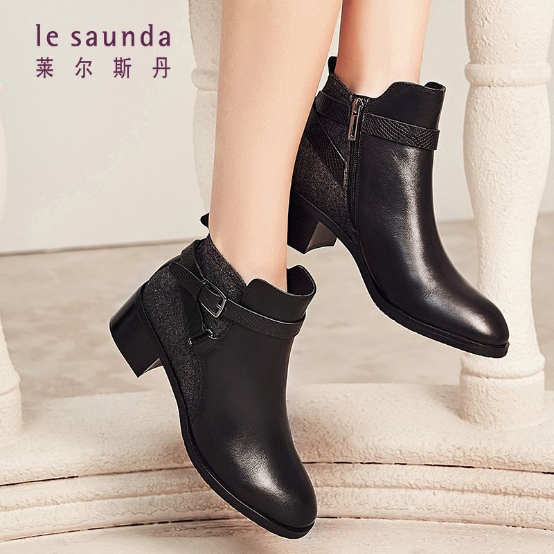 莱尔斯丹 2017秋冬季圆头粗跟中跟短靴百搭真皮女靴子
