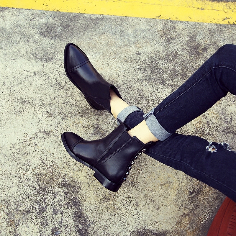 欧洲站2017秋冬新款女鞋欧美百搭真皮平底尖头铆钉短靴踝靴女靴子
