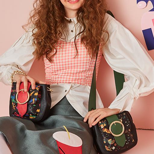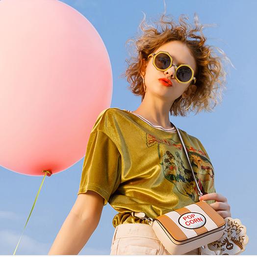 有着娇俏少女的感觉,给人视觉上的冲击,时尚经典,趣味印花图案,手机,雅致圆环设计,肩带可拆卸,一款链条。可装伞钱包皮夹。出街无忧。