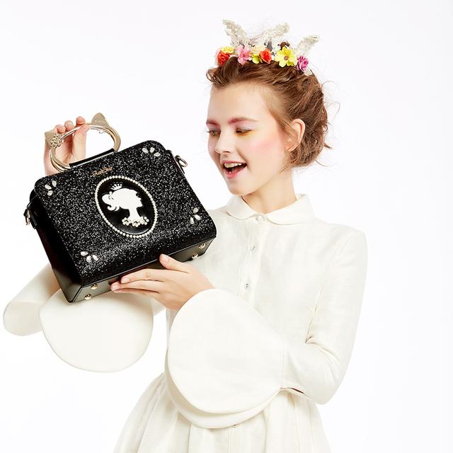 非常个性的斜挎包,黑色上亮片的图案,个性又别致。外形挺括不仅能保证轮廓鲜明,还能很好的保护内里物品。趣味十足的拎环,可爱的小猫轮廓,处处洋溢着少女甜美。