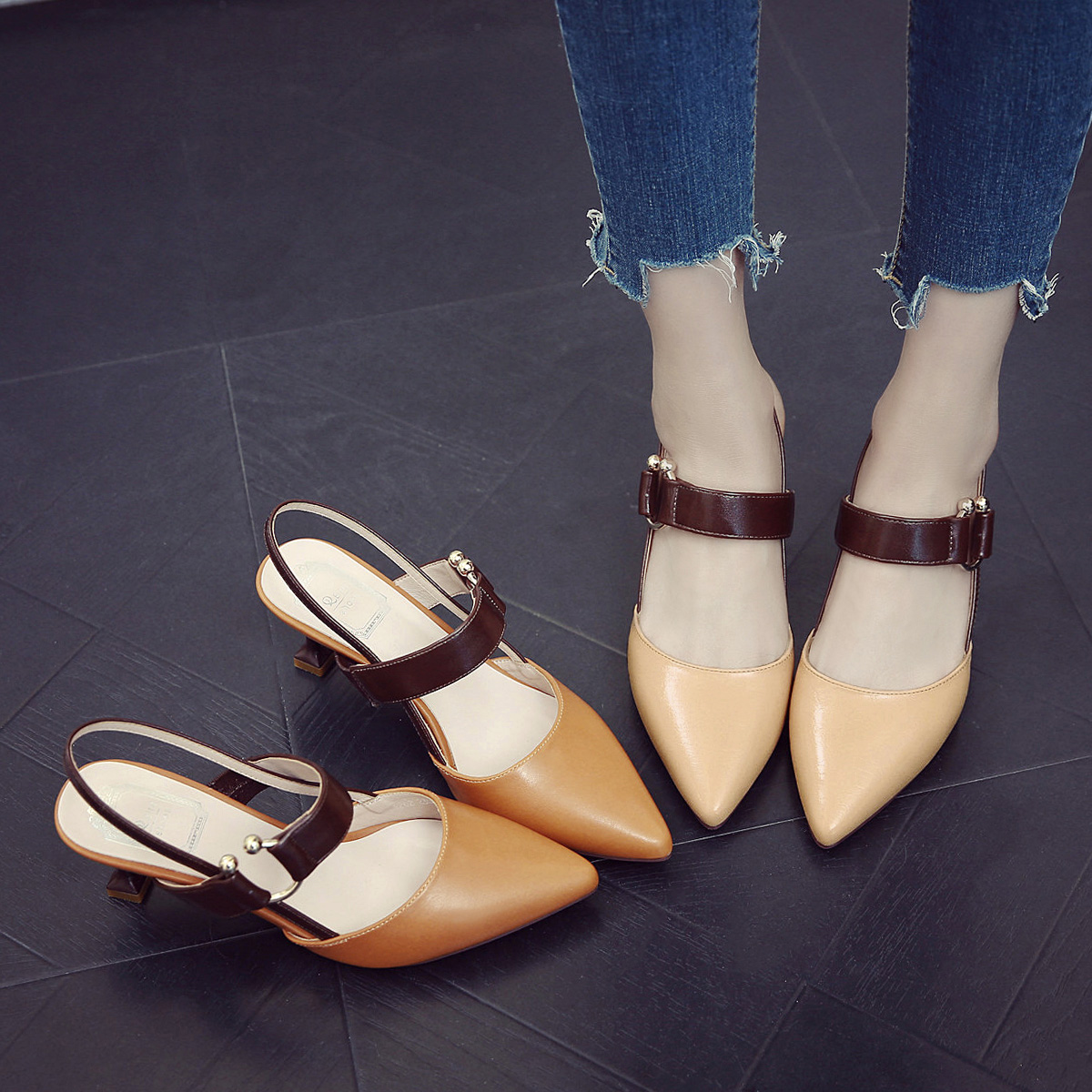 尖头高跟鞋女夏2017新款真皮韩版中空女鞋百搭一字带细跟包头凉鞋