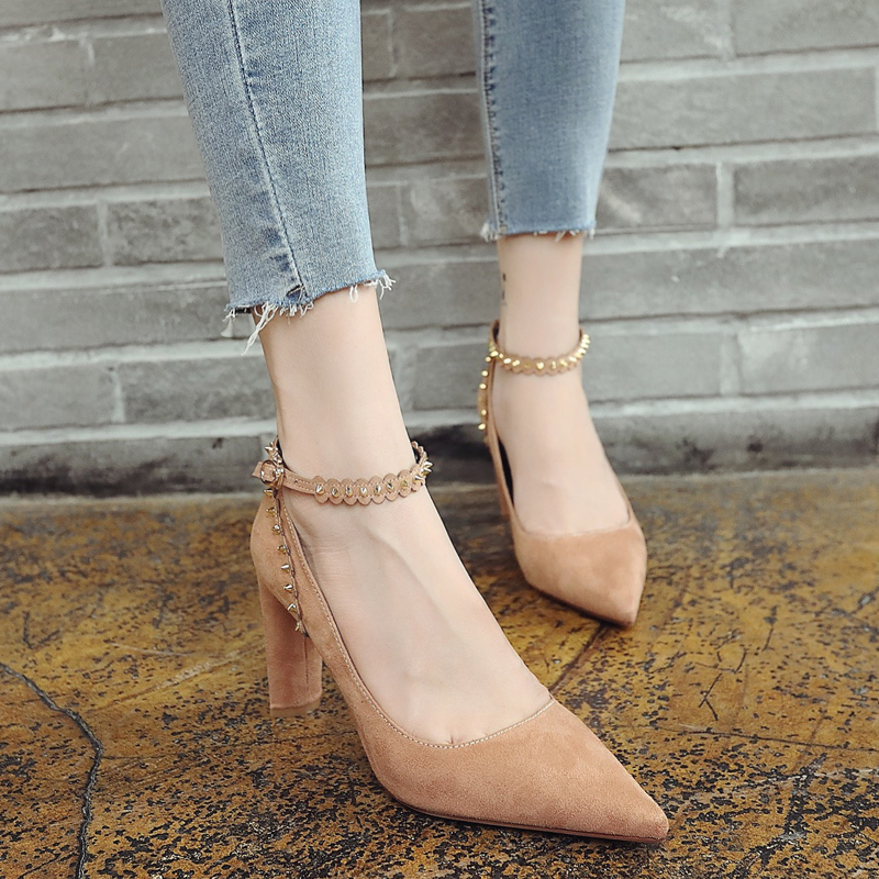 百搭尖头粗跟高跟鞋,采用绒面面料,粗跟设计,优雅的一字扣增加舒适度,穿起来甜美可爱呈现出十足的女人味,脚感舒适,抗汗散潮,让双脚自由呼吸,无论逛街约会穿久了也不会很累脚。