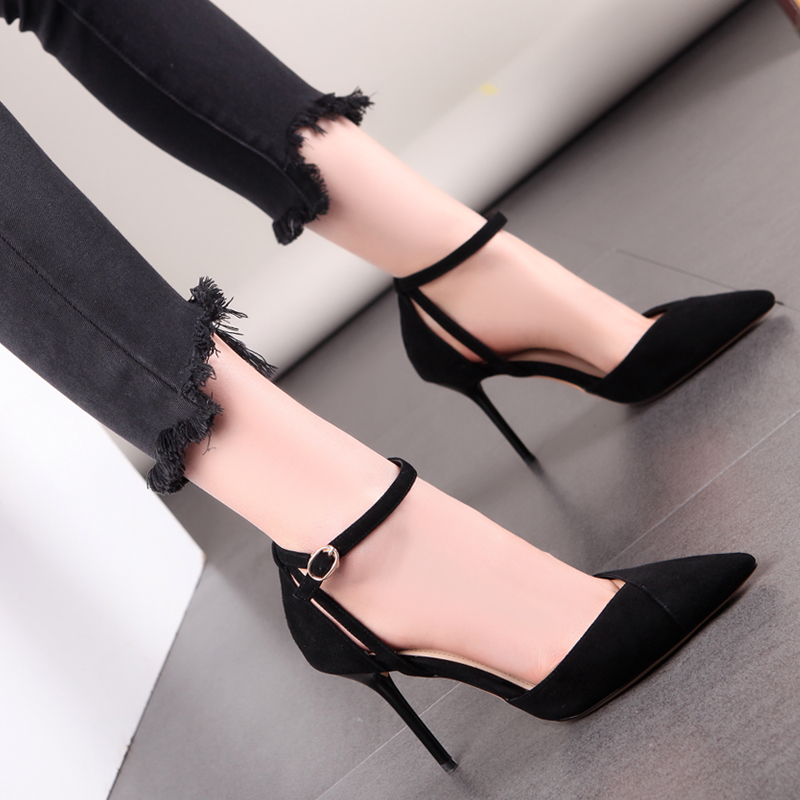 钎金鸟一字扣凉鞋女细跟尖头高跟鞋少女韩版百搭女鞋夏季2017新款