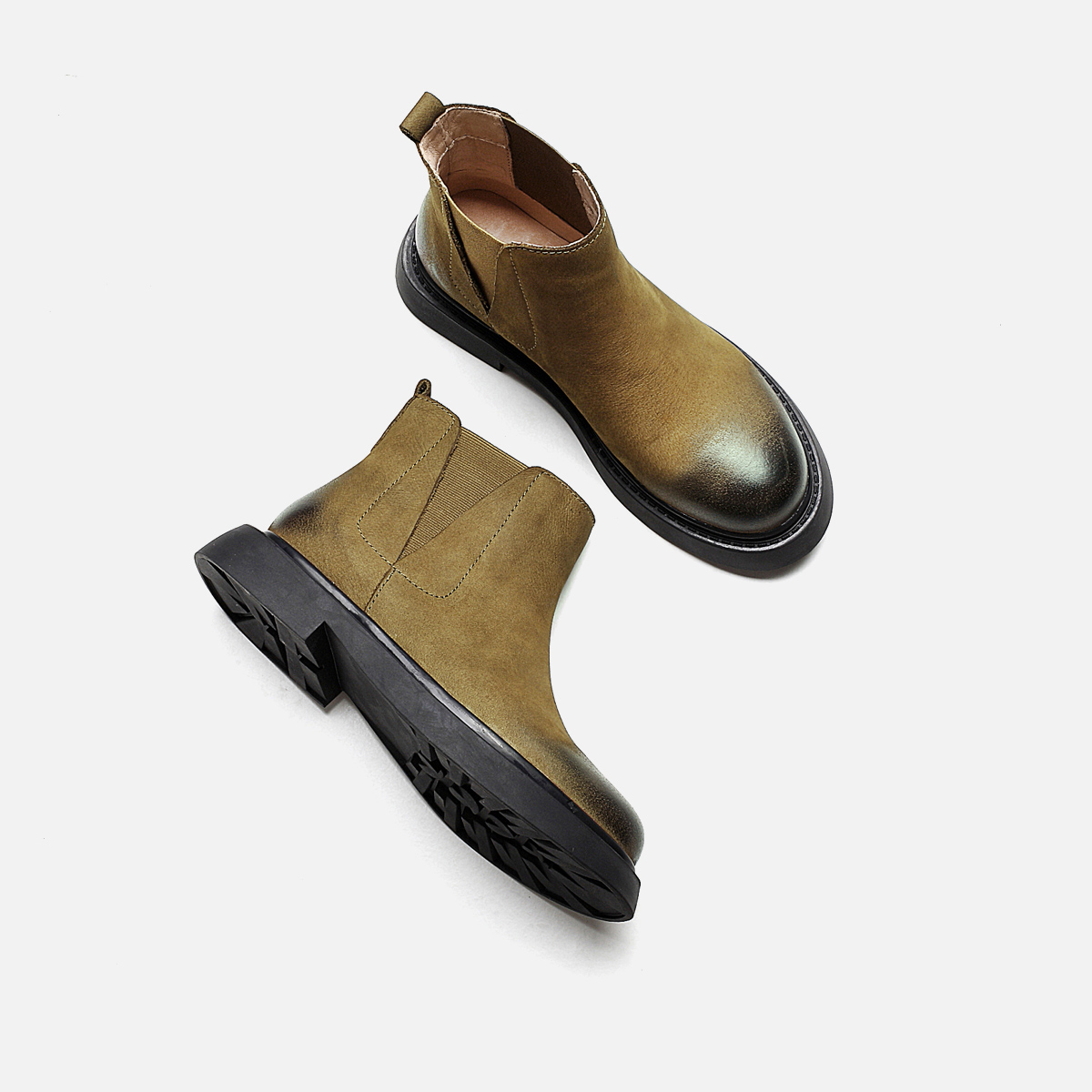 这款平底的小短靴采用驼色的颜色为底色, 磨砂皮的面料, 靴筒棒带的设计提升了这款靴子的设计感。也让你在穿脱的时候感觉更加的便利一些。