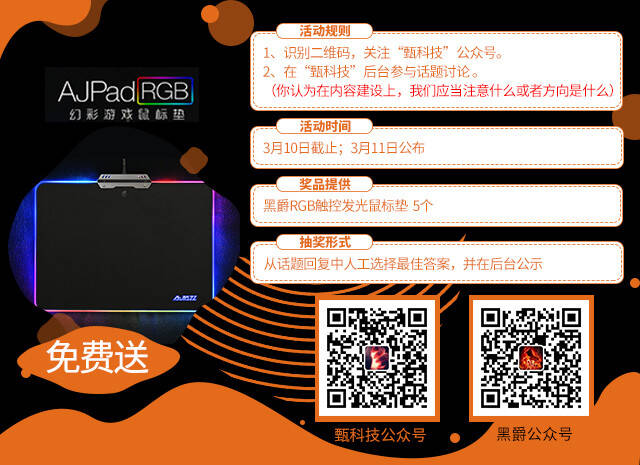 参与有奖话题讨论活动的玩家将有机会获得黑爵RGB焕彩鼠标垫一个,只要你有建设性的意见或者自己的独到的想法,都可以参与到我们公众号的话题讨论中来,活动截止到3月10日,抓紧时间行动吧!